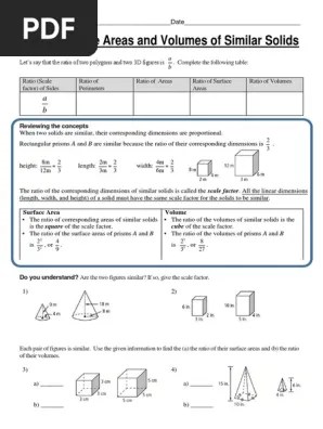 8.4 surface areas and volumes of similar solids. When the dimensions of a solid increase by a factor of k, how does the surface area change? Start studying similar solids worksheet (14.13). You can select the types of solids to work with. Some information about the surface area and volume of two similar solids has been given.